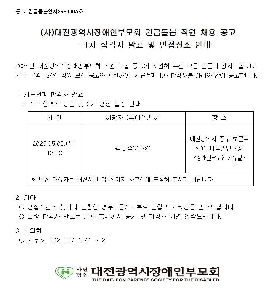 [통합] 2025년 대전장애인부모회 통합 직원 채용 공고 (1차 합격자 발표)