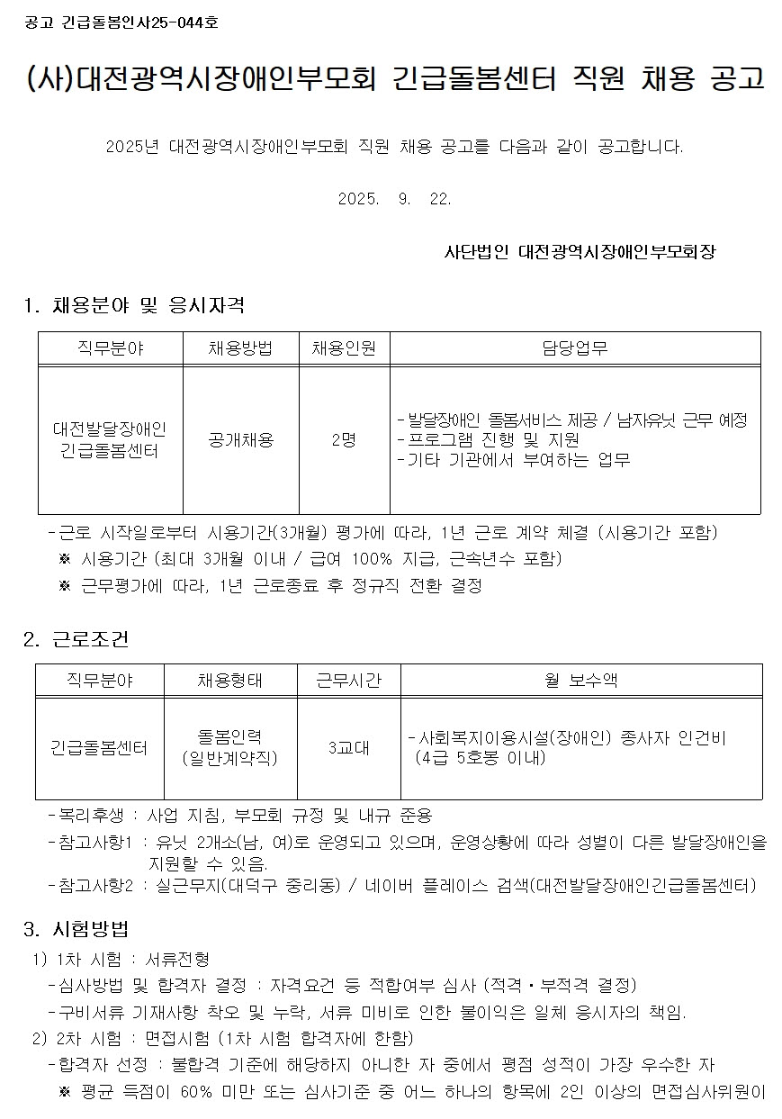 [긴급돌봄팀] (~ 9. 22.)대전발달장애인긴급돌봄센터 직원채용 공고