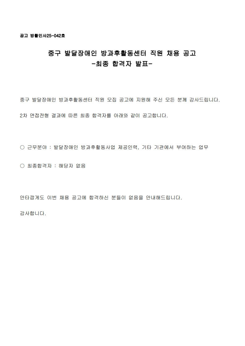 [활동서비스팀] 중구 발달장애인 방과후활동센터 직원 채용 최종 합격자 발표