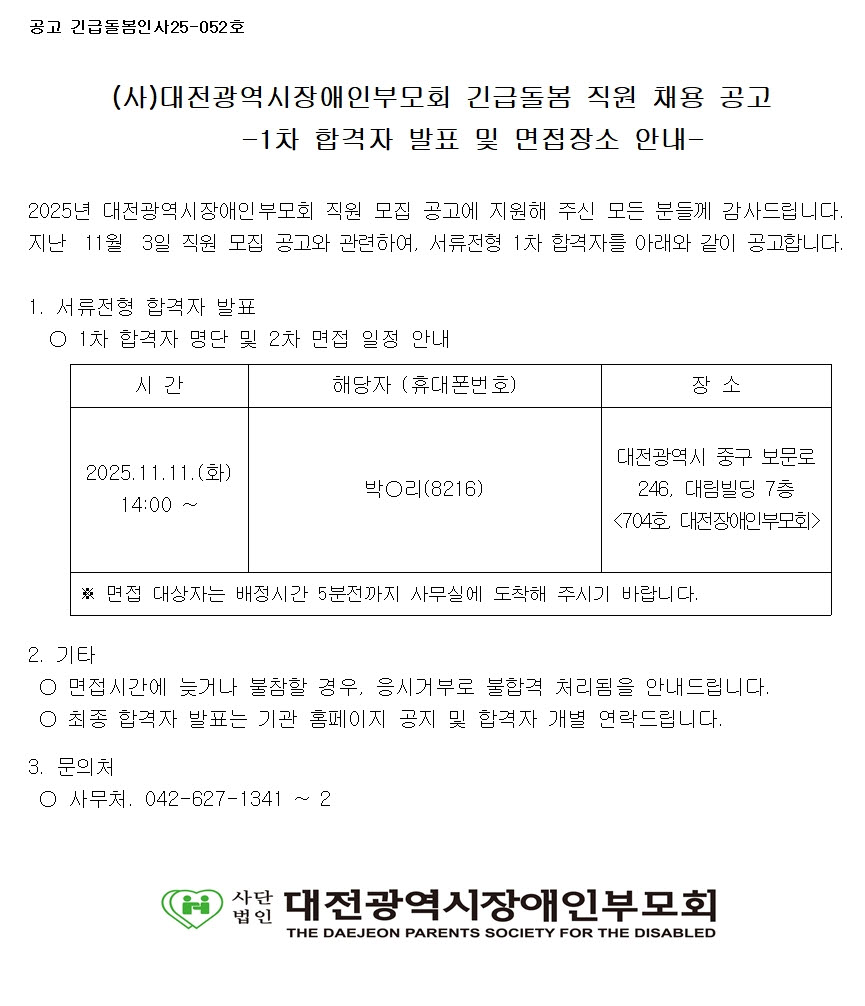 [긴급돌봄팀] 대전발달장애인긴급돌봄센터 직원채용 1차 합격자 발표