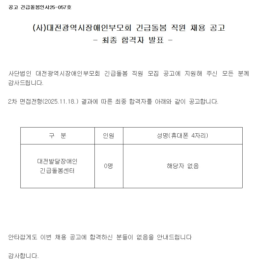 [긴급돌봄팀] 대전발달장애인긴급돌봄센터 직원채용 최종 합격자 발표