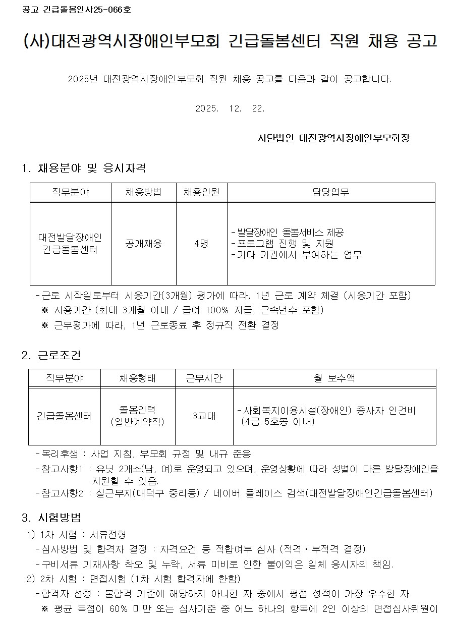 [긴급돌봄팀] (~ 1. 12.)대전발달장애인긴급돌봄센터 직원채용 공고