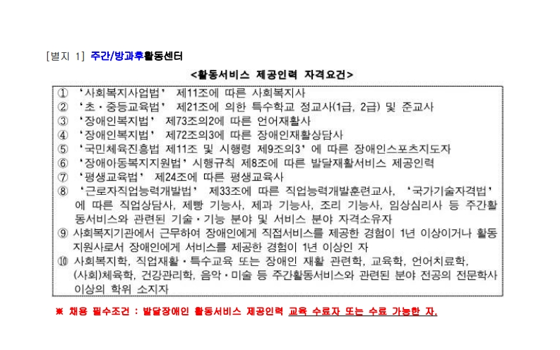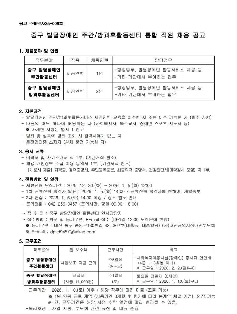 [활동서비스팀] 중구 발달장애인 주간/방과후활동센터 통합 직원 채용 공고(~12.29)…