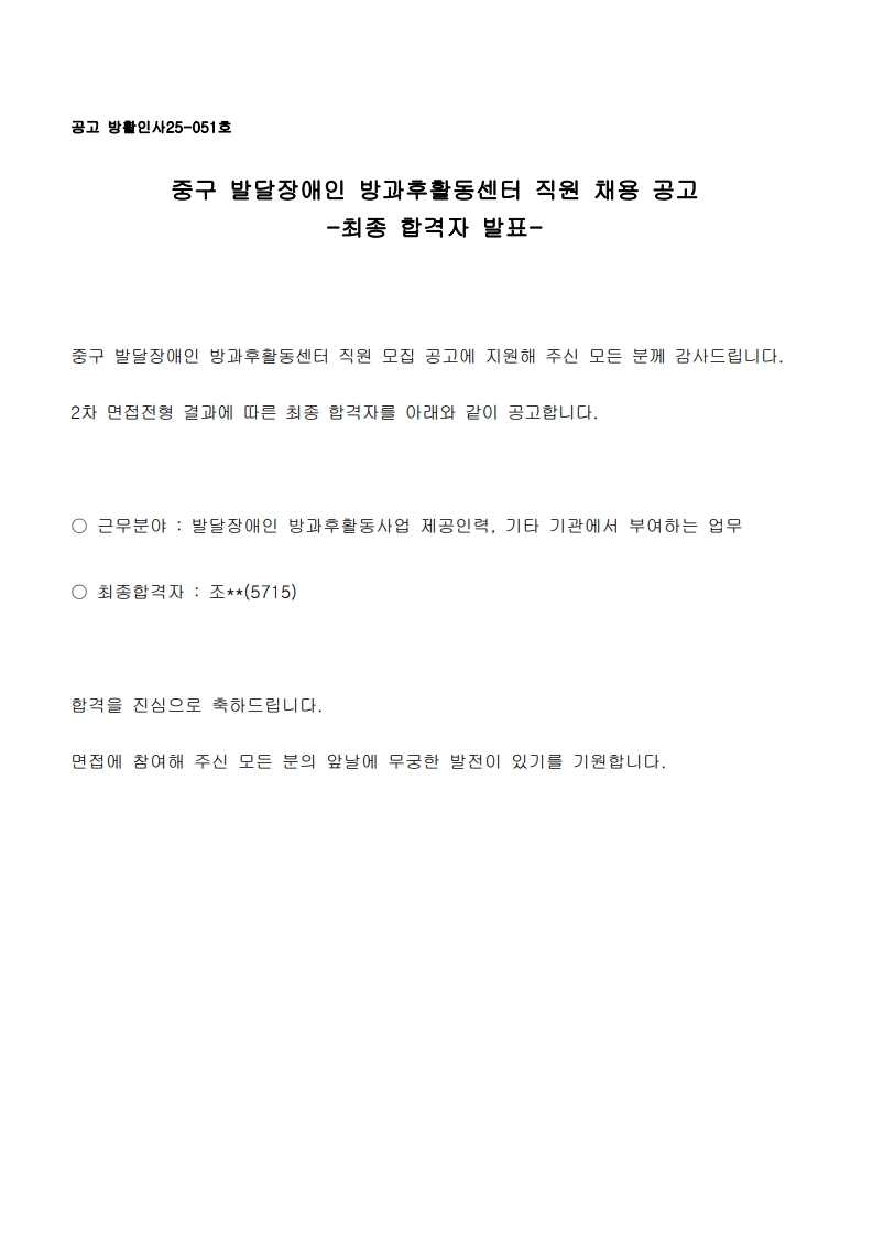 [활동서비스팀] 중구 발달장애인 방과후활동센터 직원 채용 최종 합격자 발표