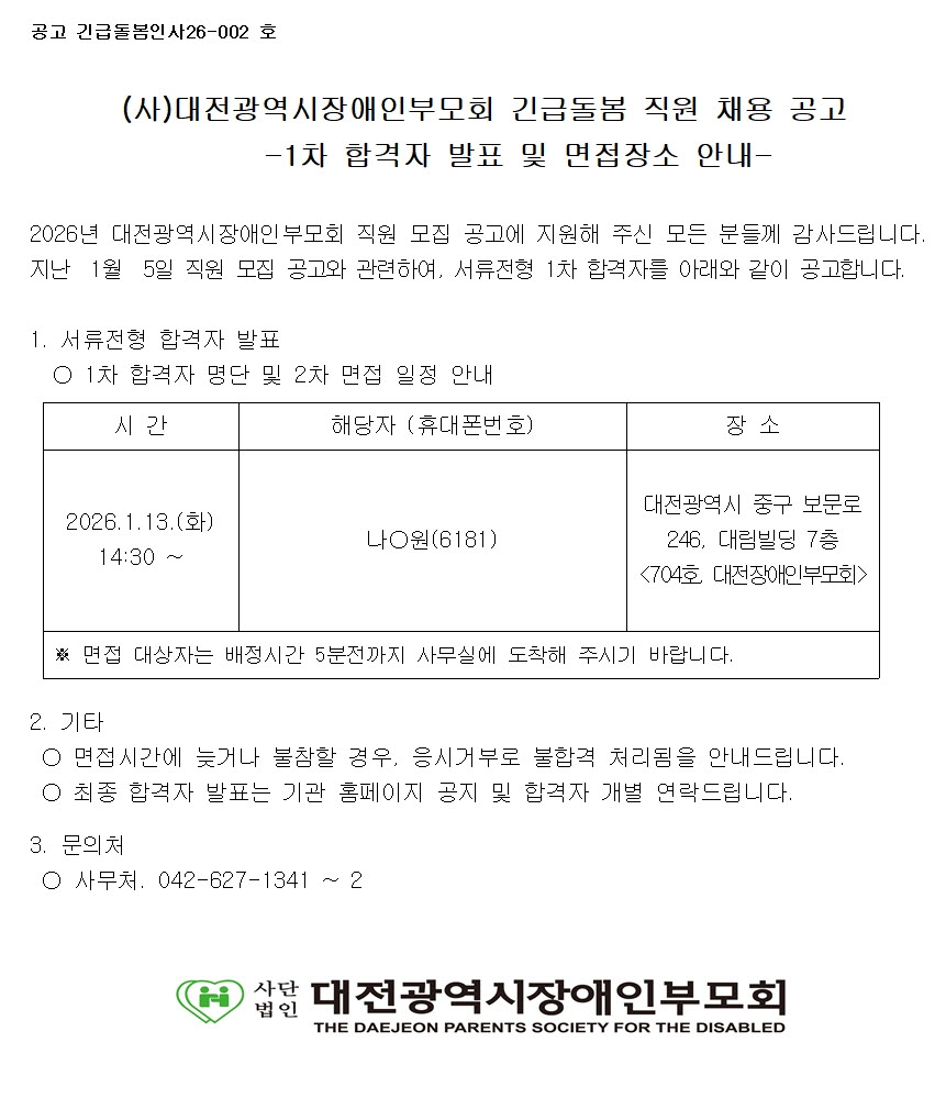 [긴급돌봄팀] 대전발달장애인긴급돌봄센터 직원채용 1차 합격자 발표
