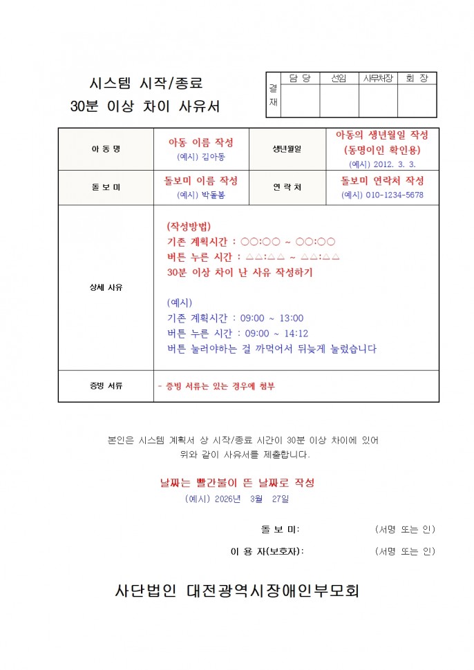 시스템 내 시작/종료 시간 둘 중 하나라도 계획 시간과 30분 이상 차이가 날 경우 첨부파일에 있는 양식을 출력하여 작성하신 후, 부모회 사무실로 제출해 주시길 바랍니다.