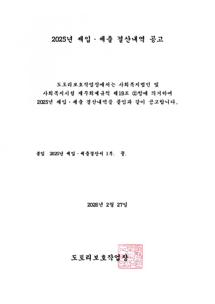 2025년 도토리보호작업장 세입 세출 결산내역 공고
