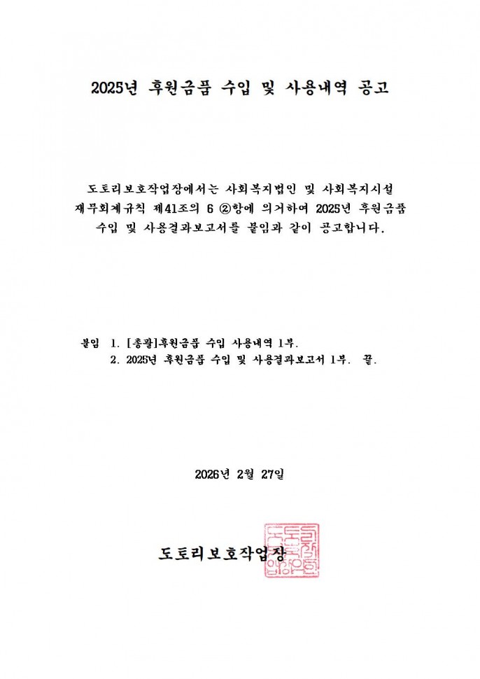 2025년 도토리보호작업장 세입 세출 결산내역 공고