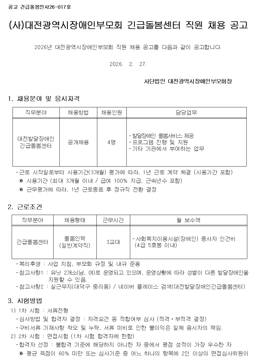 [긴급돌봄팀] (~ 2. 26.)대전발달장애인긴급돌봄센터 직원채용 공고