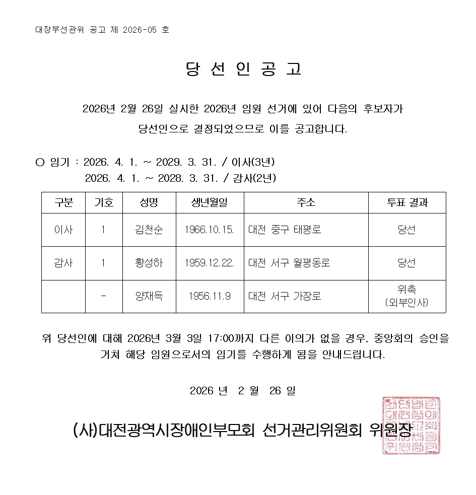 2026년 임원 선거 당선자 공고