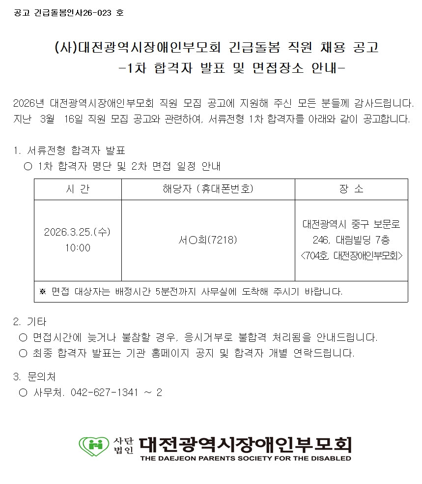 [긴급돌봄팀] 대전발달장애인긴급돌봄센터 직원채용 1차 합격자 발표