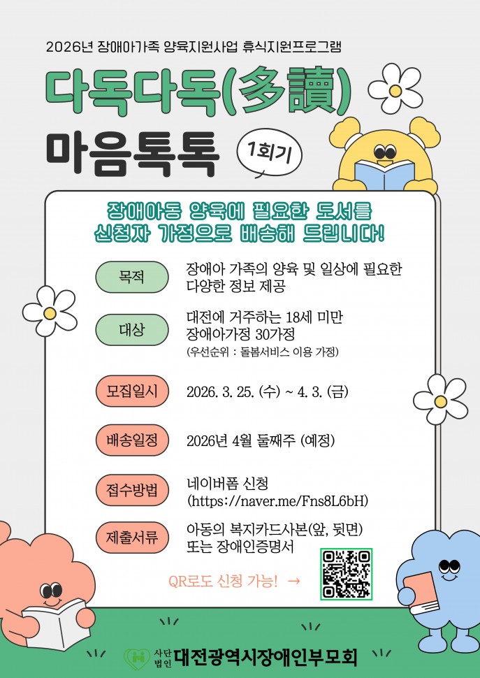 공지 [장애아가족 양육지원사업] 휴식지원프로그램 교육제공-다독다독(多讀) 마음톡톡(1회기)