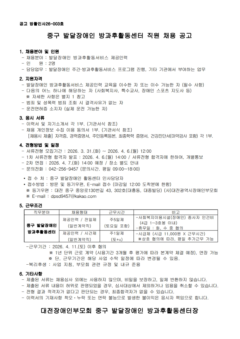 [활동서비스팀] 중구 발달장애인 방과후활동센터 직원 채용 공고(~4.20)