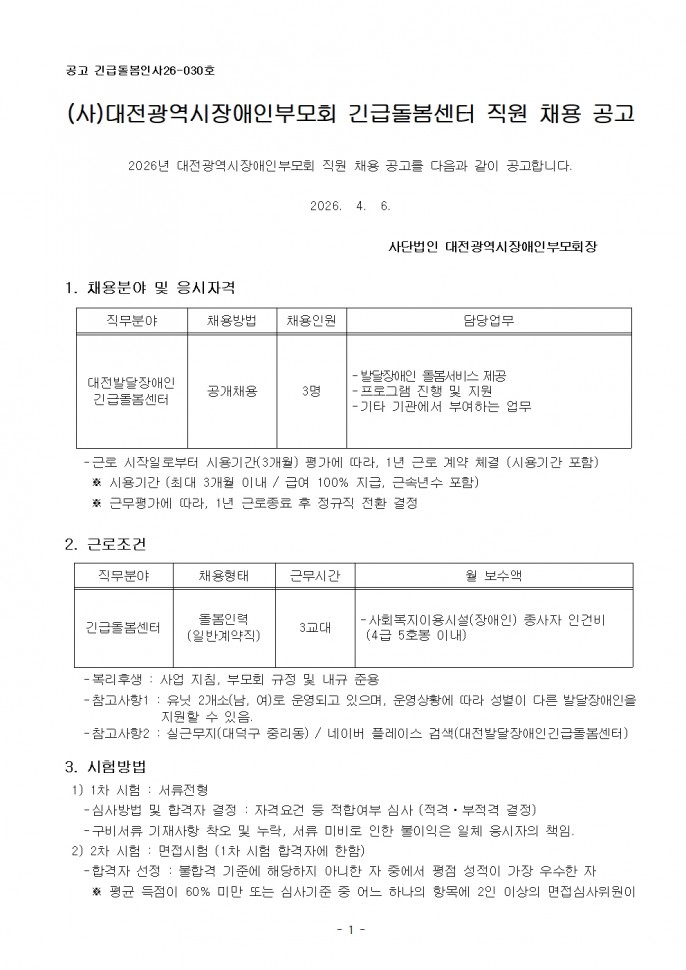 [긴급돌봄팀] (~ 4. 6.)대전발달장애인긴급돌봄센터 직원채용 공고