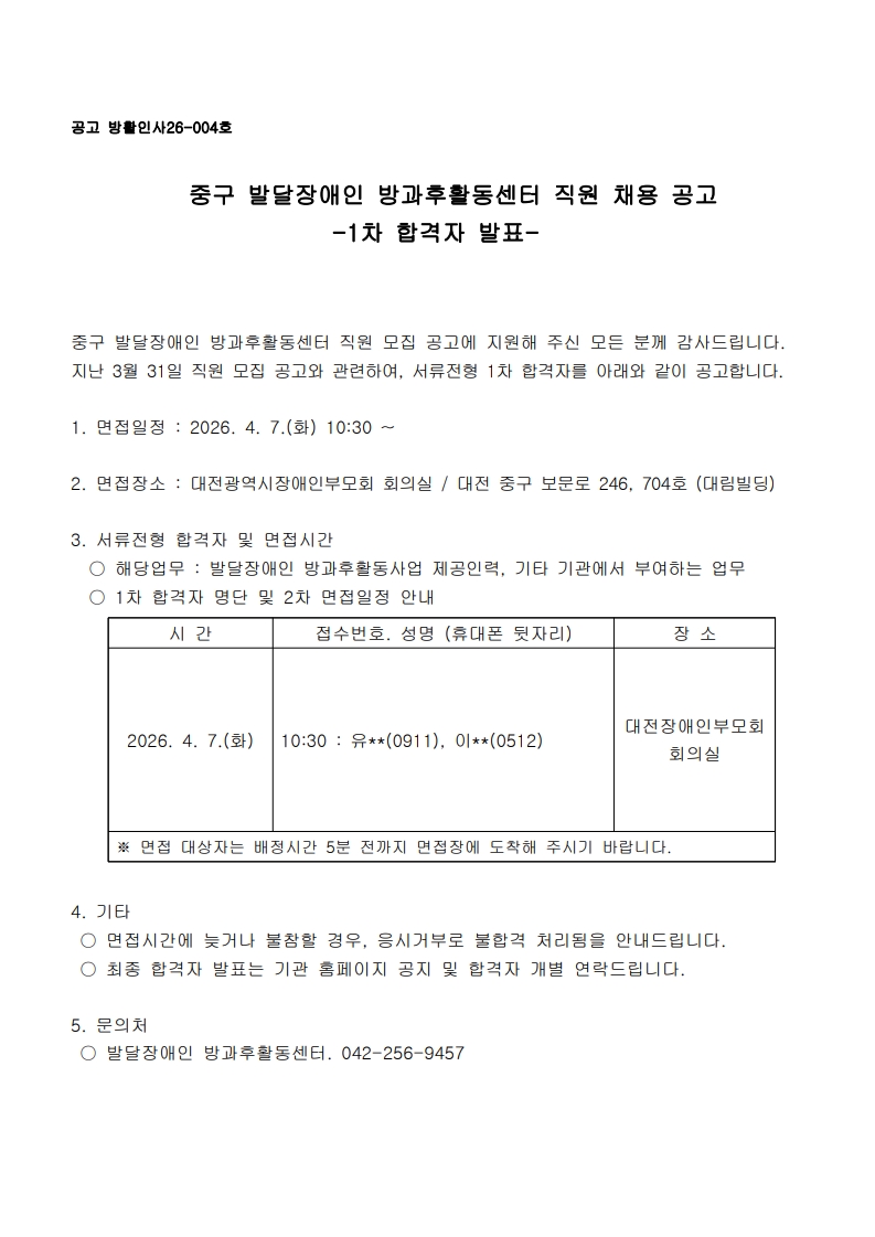 [긴급돌봄팀] 대전발달장애인긴급돌봄센터 직원채용 1차 합격자 발표