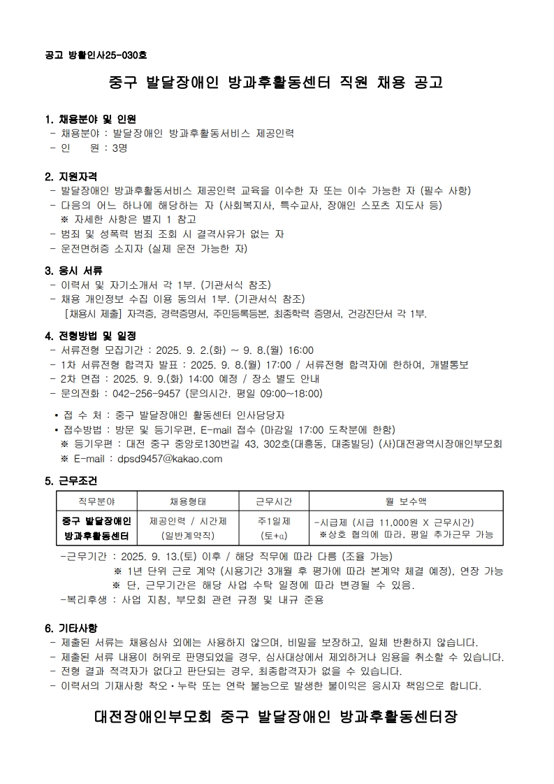 [활동서비스팀] 중구 발달장애인 방과후활동센터 직원 채용 공고(~9.22)