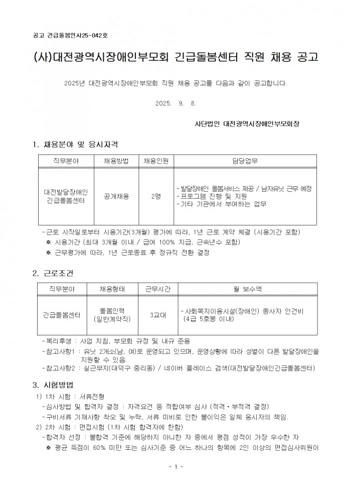 [긴급돌봄팀] [긴급돌봄팀] (~ 9. 29.)대전발달장애인긴급돌봄센터 직원채용…