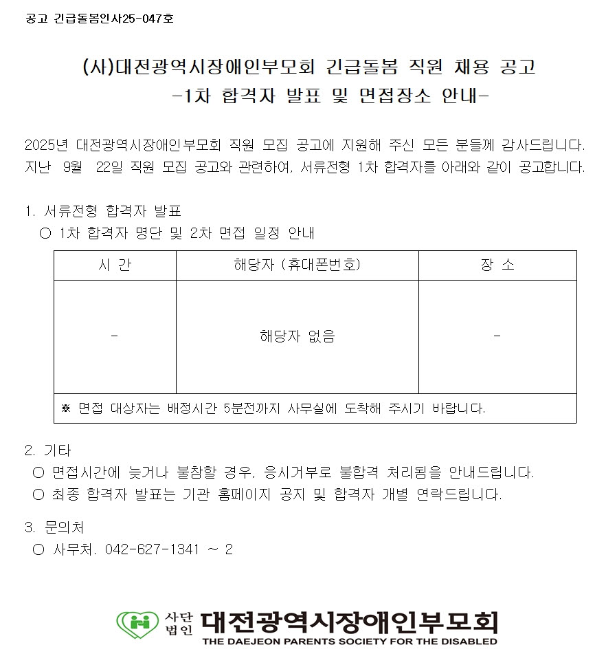 [긴급돌봄팀] 대전발달장애인긴급돌봄센터 직원채용 1차 합격자 발표