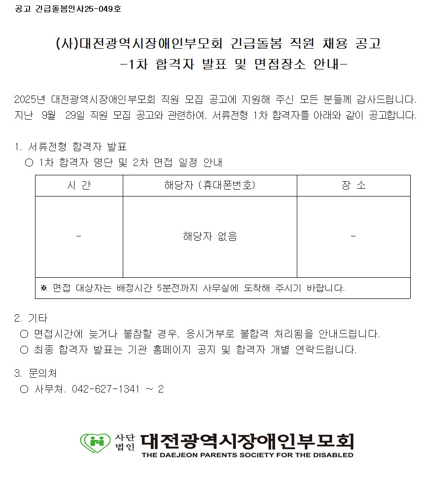[긴급돌봄팀] 대전발달장애인긴급돌봄센터 직원채용 1차 합격자 발표