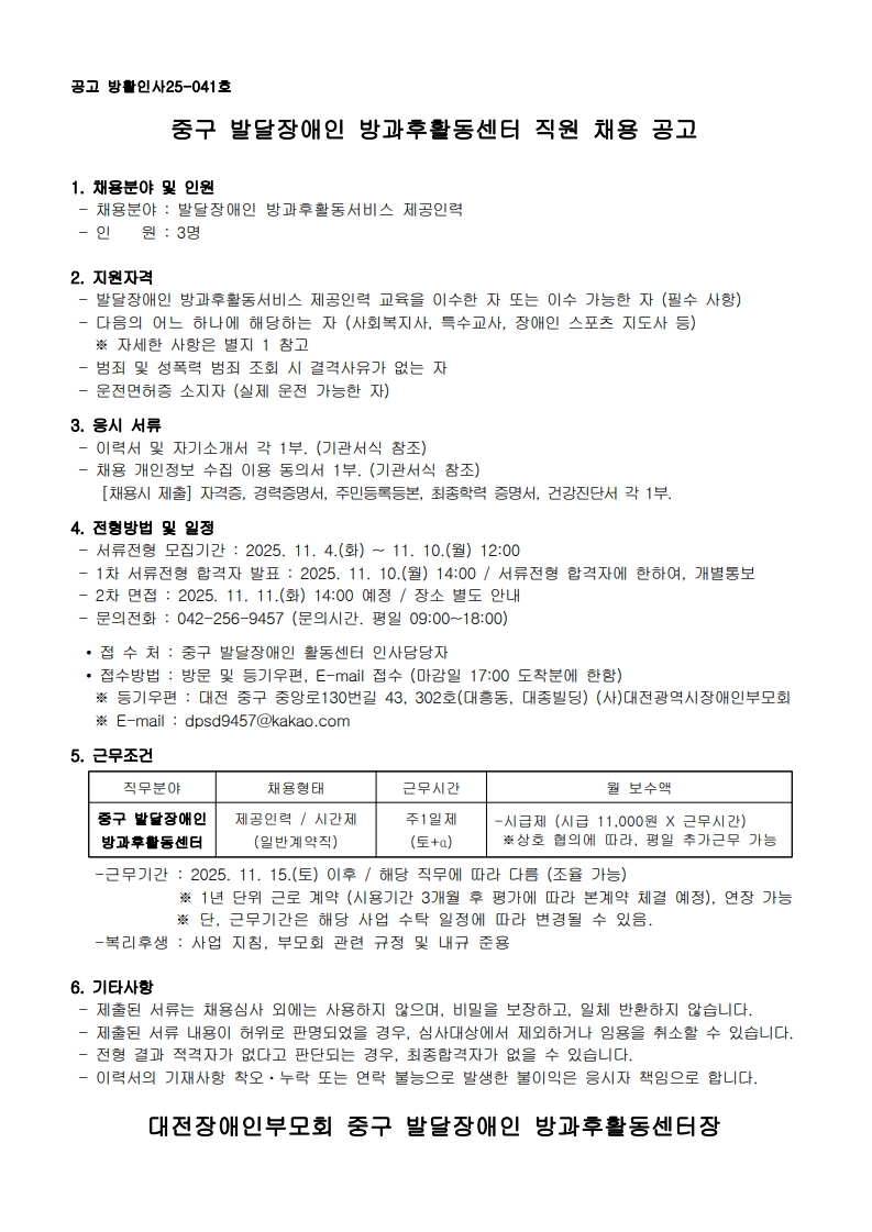 [활동서비스팀] 중구 발달장애인 방과후활동센터 직원 채용 공고(~11.17)