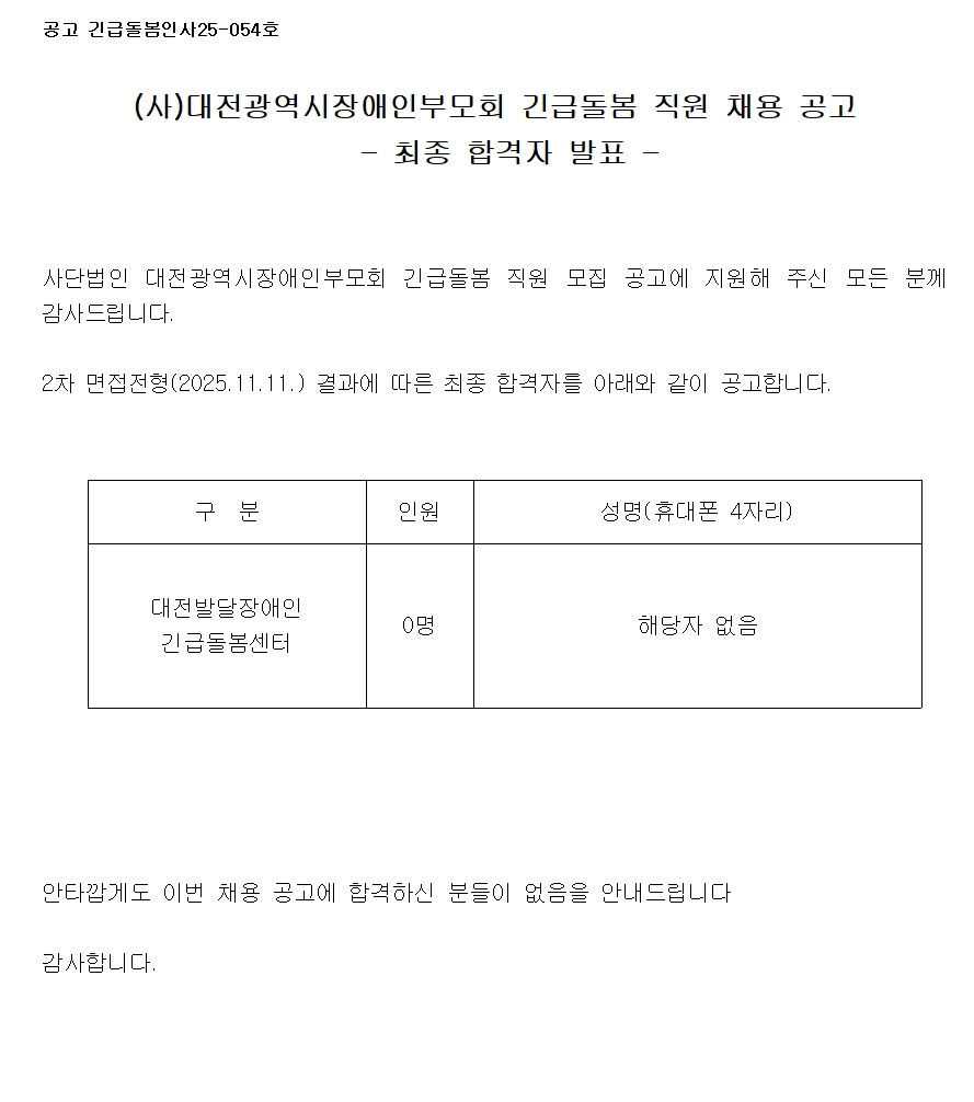[긴급돌봄팀] 대전발달장애인긴급돌봄센터 직원채용 최종 합격자 발표