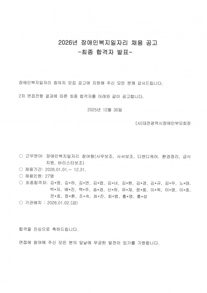 [2026년 장애인복지일자리(참여형) 합격자 공고]