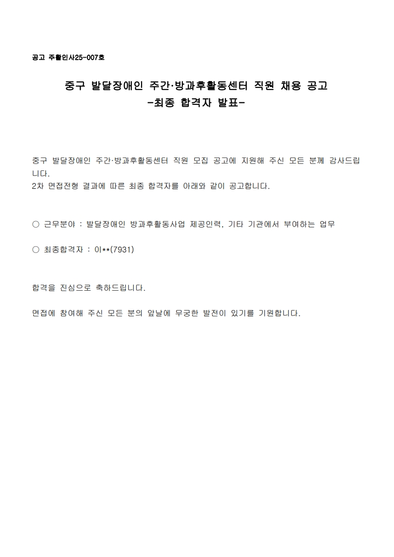 [활동서비스팀] 중구 발달장애인 주간활동센터 직원 채용 최종 합격자 발표