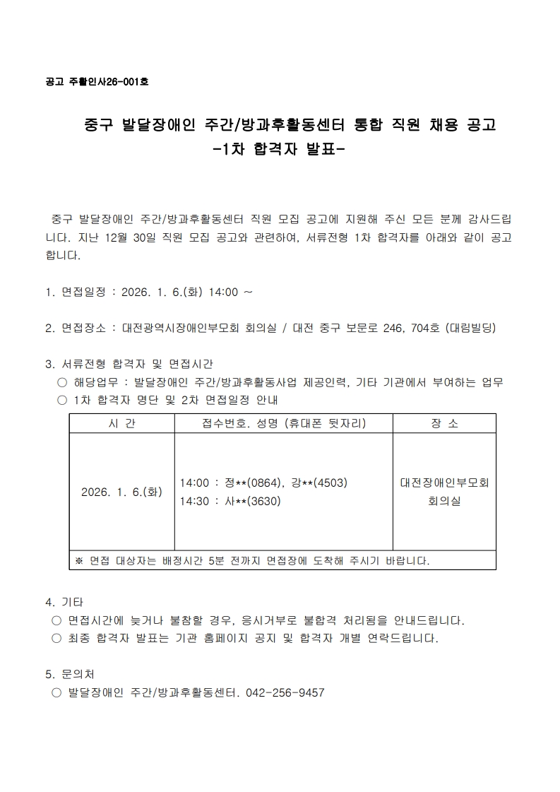 [활동서비스팀] 중구 발달장애인 주간활동센터 직원 채용 1차 합격자 발표