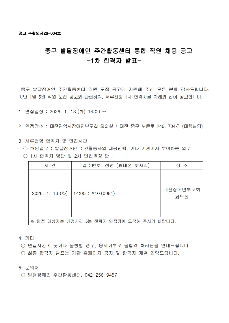 [활동서비스팀] 중구 발달장애인 주간활동센터 직원 채용 1차 합격자 발표