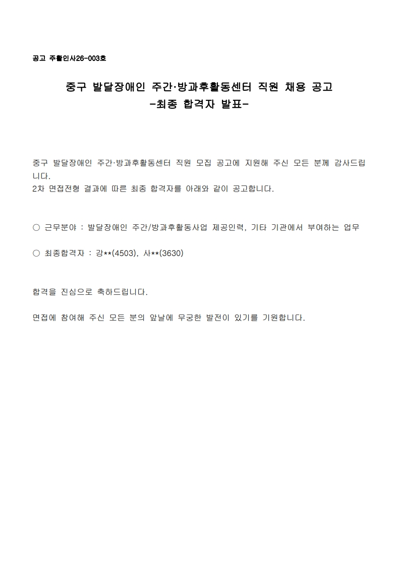 [활동서비스팀] 중구 발달장애인 주간활동센터 직원 채용 최종 합격자 발표
