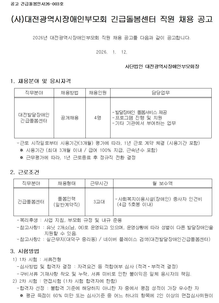 [긴급돌봄팀] (~ 1. 26.)대전발달장애인긴급돌봄센터 직원채용 공고