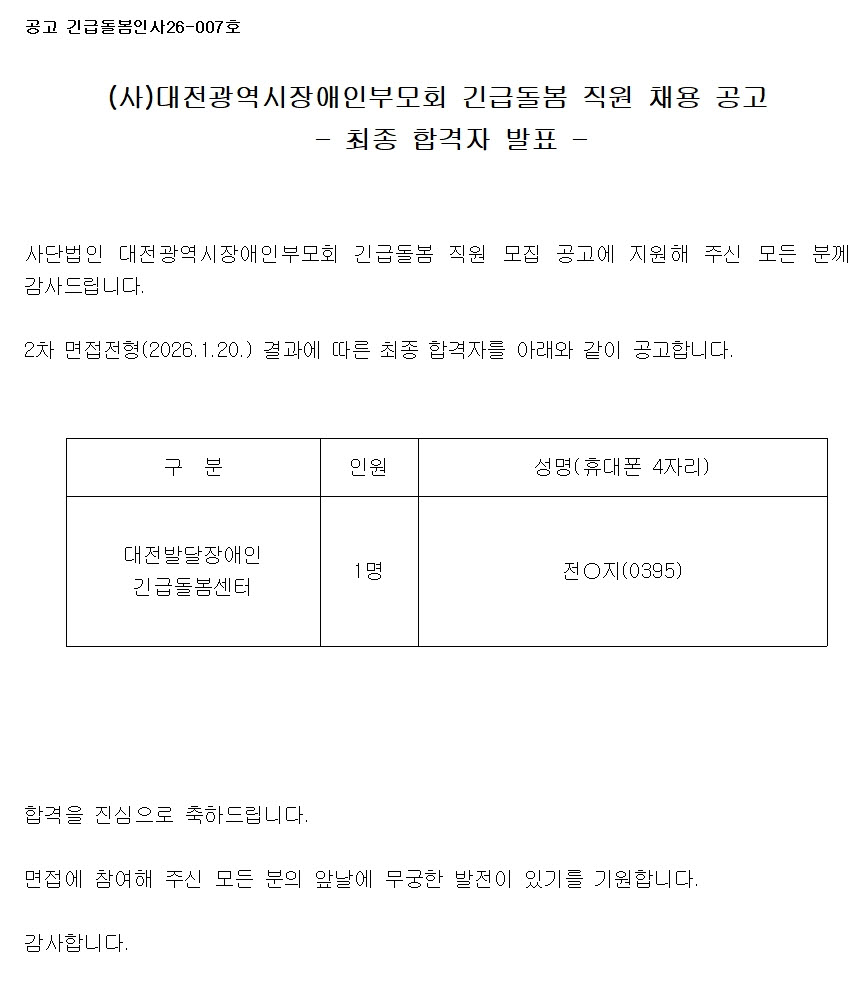 [긴급돌봄팀] 대전발달장애인긴급돌봄센터 직원채용 최종 합격자 발표