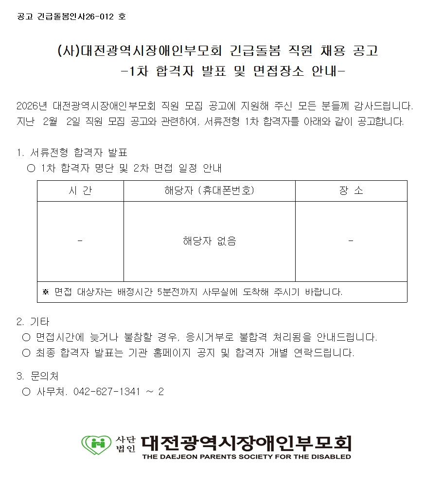[긴급돌봄팀] 대전발달장애인긴급돌봄센터 직원채용 1차 합격자 발표