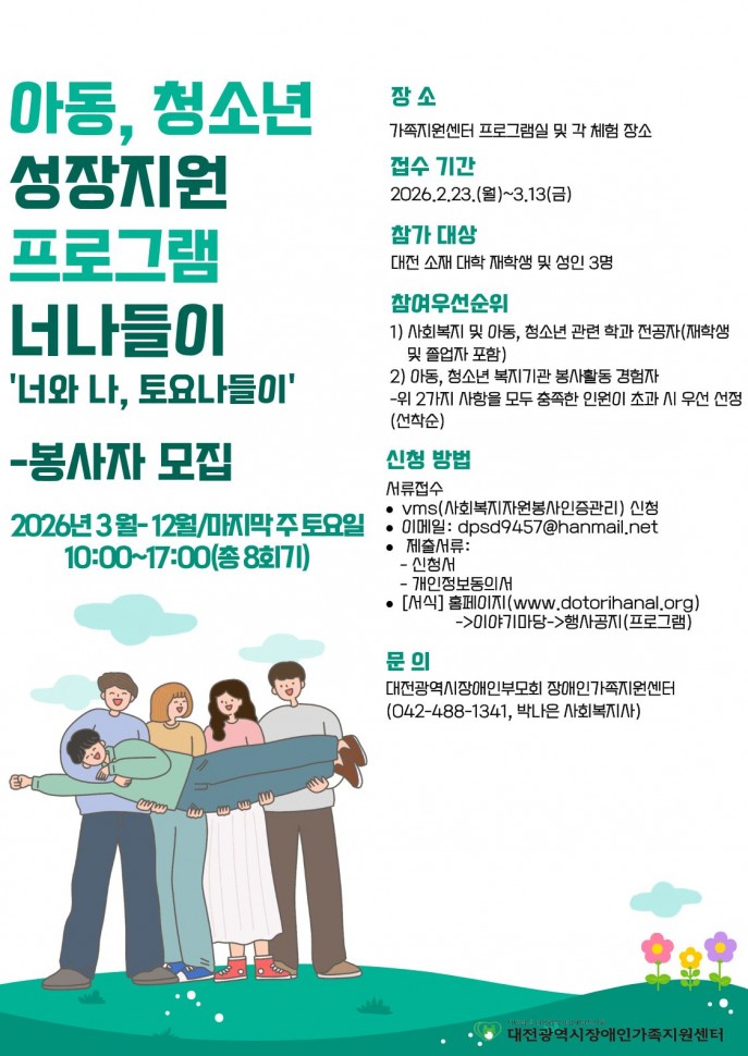 공지 2026년 가족역량강화사업 아동, 청소년 성장지원 너나들이- ‘너와 나, 토요나들이’ 봉사자 모집 안내