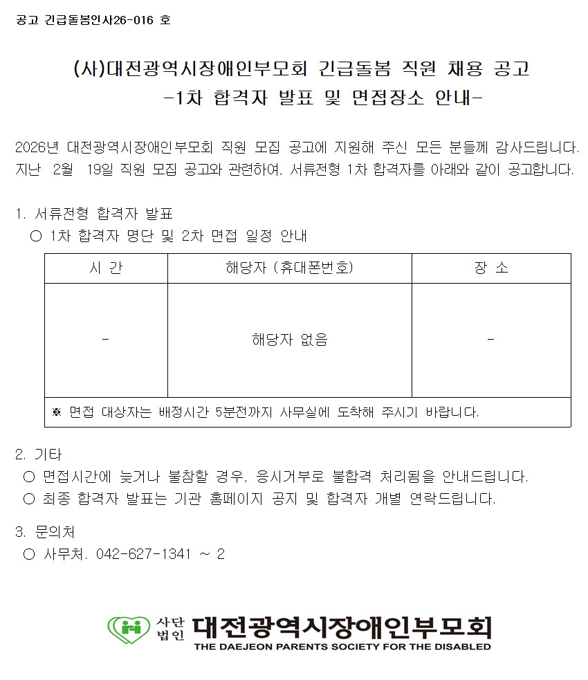 [긴급돌봄팀] 대전발달장애인긴급돌봄센터 직원채용 1차 합격자 발표