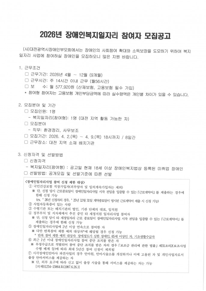 2026년도 장애인복지일자리(참여형) 참여자 추가 모집공고