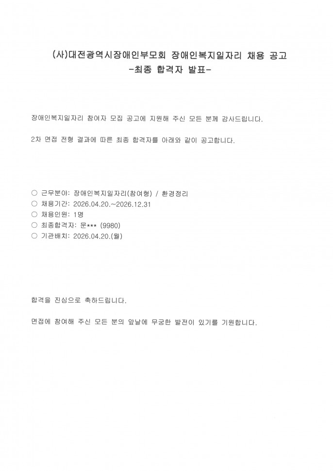 [2026년 장애인복지일자리(참여형) 참여자 추가모집 합격자 공고]